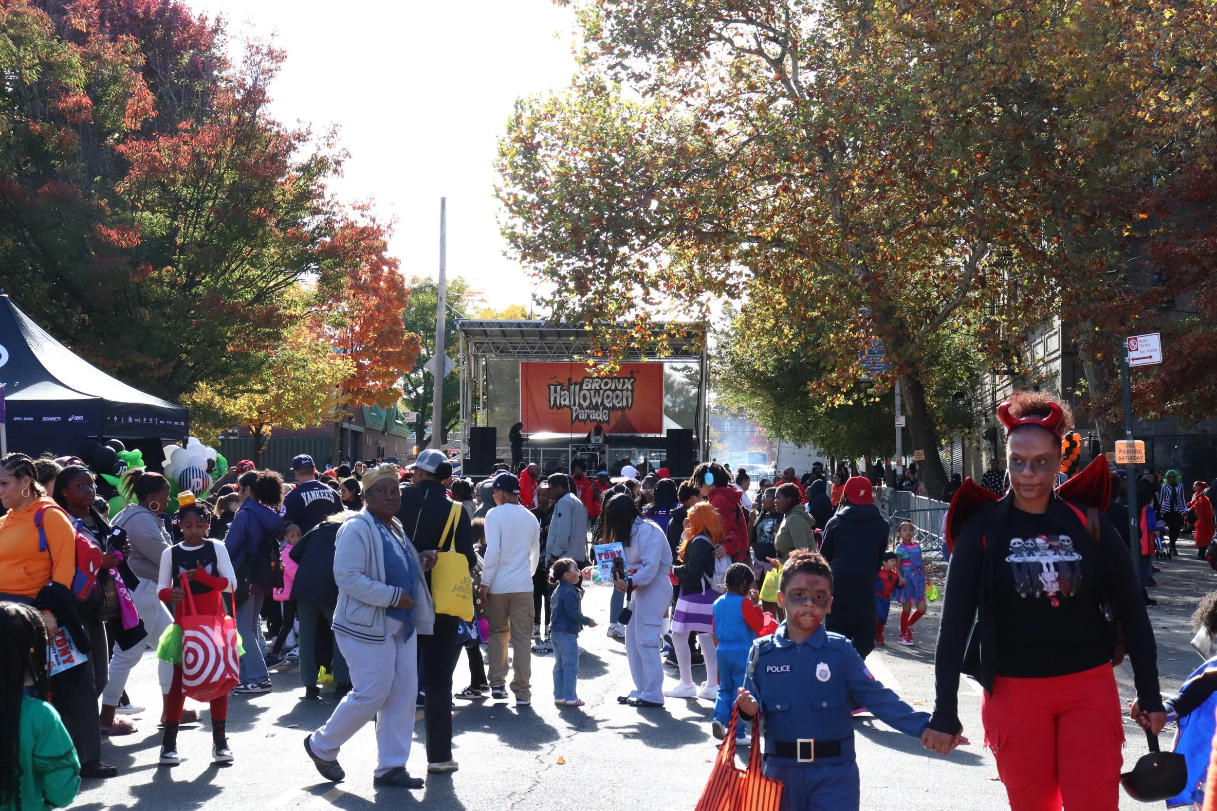 The crowd gathered in front of the Bronx Halloween Parade stage, waiting for the program to begin. By Usha Sookai.