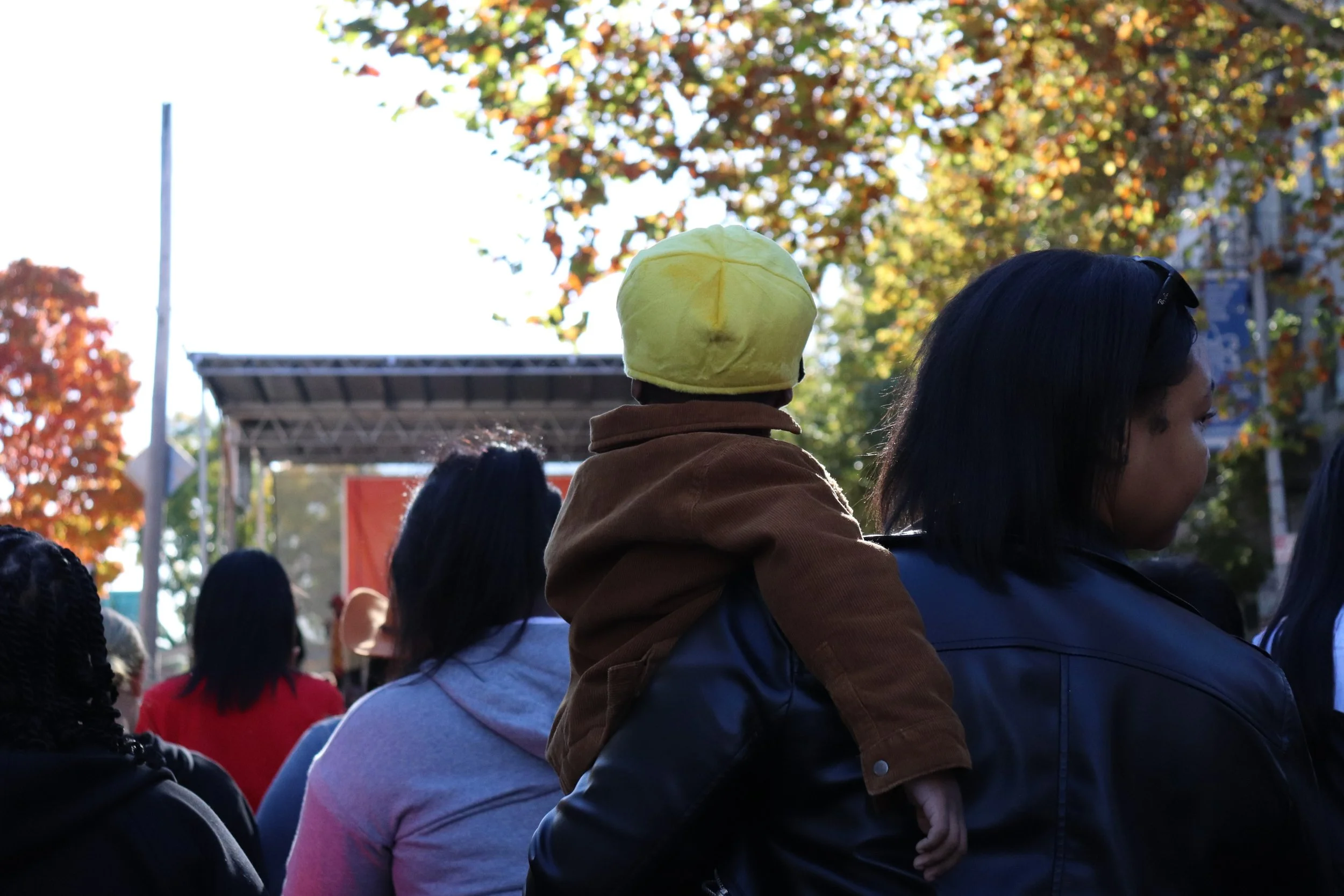 A parent holding their child up to see the Bronx Halloween Parade stage. By Usha Sookai.